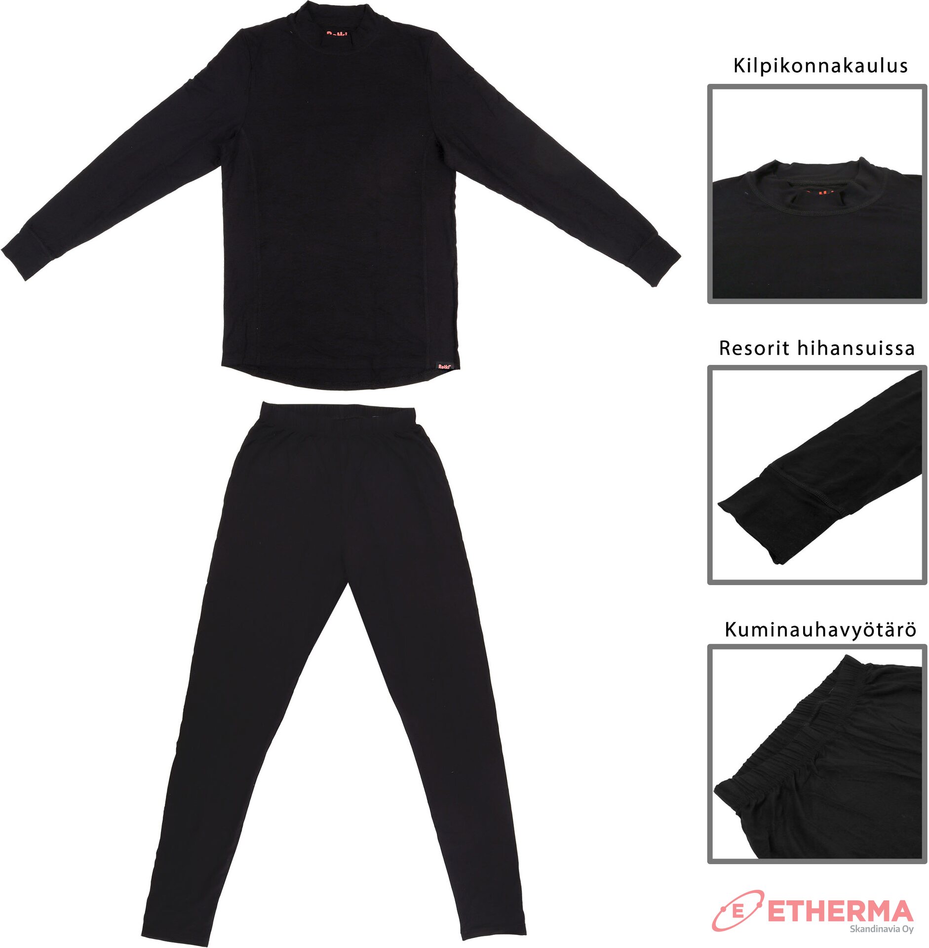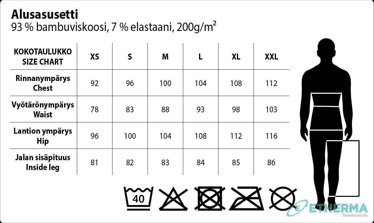 Bambusta ja elastaanista valmistettu alusasu aktiiviseen elämään ja retkeilyyn. Bambun ansiosta alusasu tuntuu lämpimältä viileällä säällä ja viileältä lämpimällä säällä. Bambu on antibakteerinen materiaali. Pitkät hihat, lahkeissa resorit. Kuminauhavyötärö.