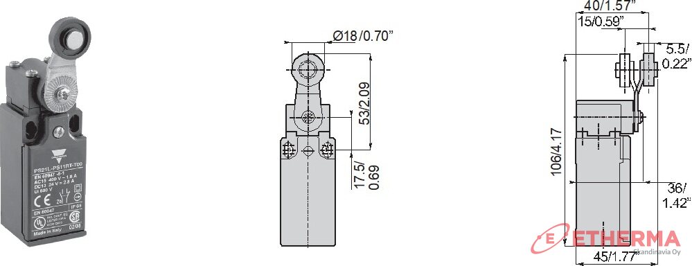 Toimintatapa: Nylon‑materiaalia oleva rullavarsi (roller lever) – mahdollistaa fyysisen liikkeen tunnistamisen kohteen vieressä.