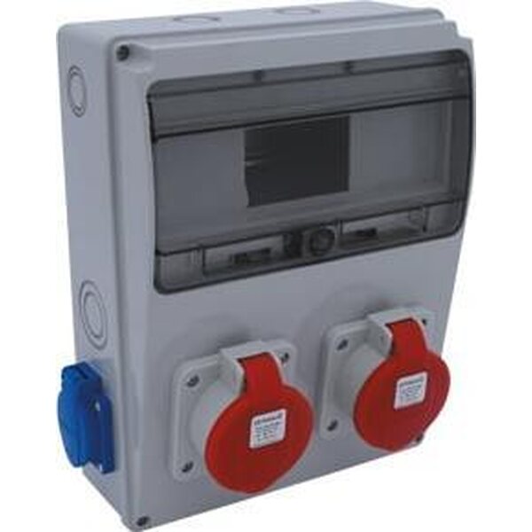 Pistorasiakotelo, jossa mukana 2kpl 5P 32A voimapistorasia ja 2kpl 2P schuko. Kotelointiluokka IP65.
