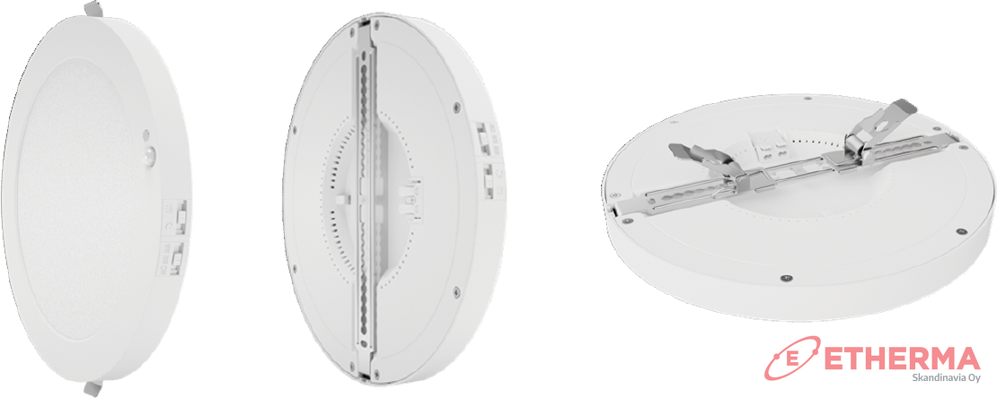 12W helposti asennettava LED-paneelivalaisin sisustukseen ja yleisvalaistukseen. Pinta-/Puoliuppoon asennettava, asennusreiän halkaisija: Ø55-125mm sisäänrakennettu liitäntälaite, kehyksen väri valkoinen. 230V/50Hz, 12W, 900lm, 3CCT (3000K/4000K/6500K), 3CCT = Valon värilämpötila valittavissa asennusvaiheessa, IP20/IP43, Ø167mm.