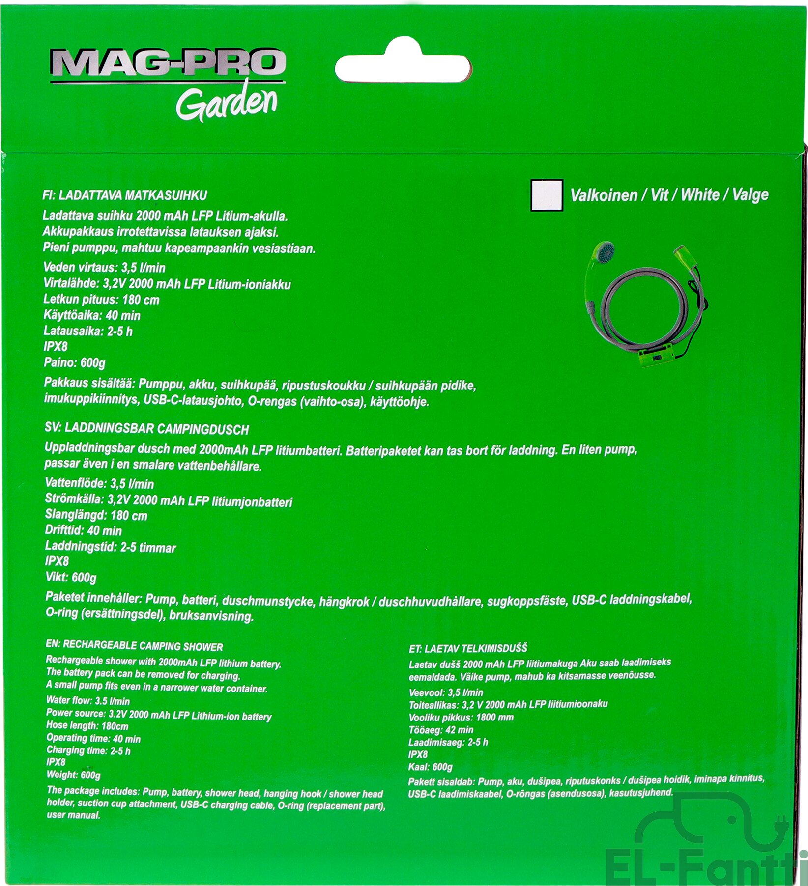 Pakkaus sisältää: Pumppu, akku, suihkupää, ripustuskoukku, suihkupään pidike, imukuppikiinnitys, USB-C-latausjohto 50cm, O-rengas (vaihto-osa), käyttöohje.
